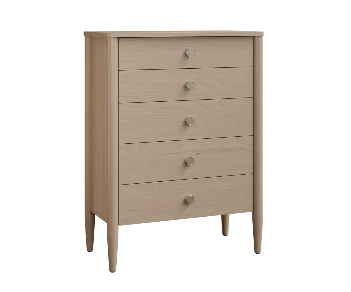 The Brady Chest of Drawers features rounded tapered legs and smooth corners for a mid-century modern look. Dimensions: 38½”W x 22″D x 52½”H