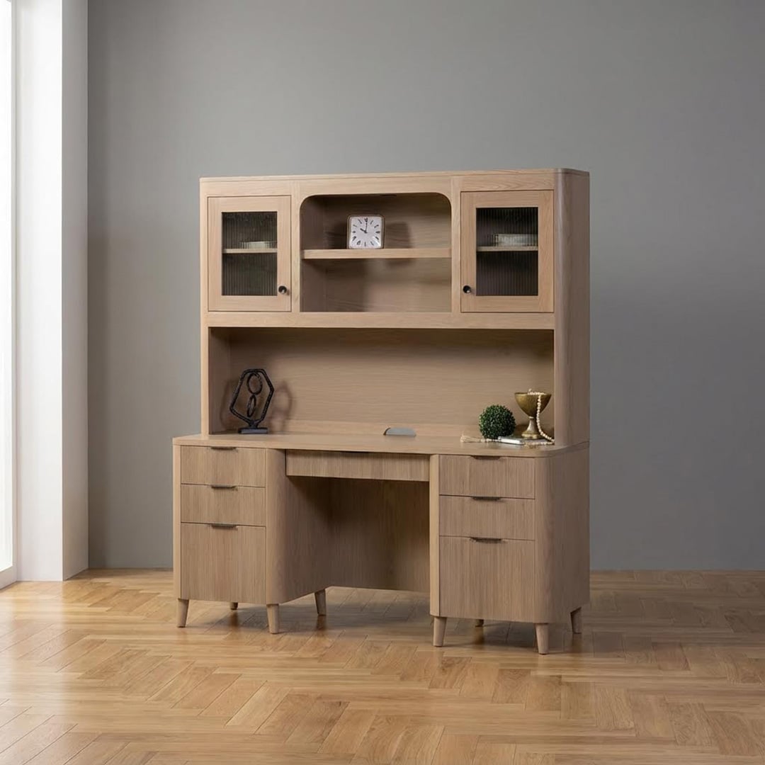 Elevate your professional sanctuary with the Branton Credenza and Hutch. This piece strikes the perfect balance between mid-century warmth and contemporary precision. Its softened silhouettes and rounded edges create an inviting atmosphere while providing a command center for your most productive days.