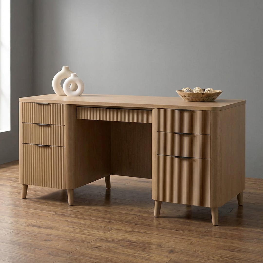 This executive desk blends refined craftsmanship with modern simplicity, making it a statement piece for any workspace. Crafted with a warm, natural wood finish, it features softly rounded edges and clean architectural lines that create a calm, sophisticated presence.