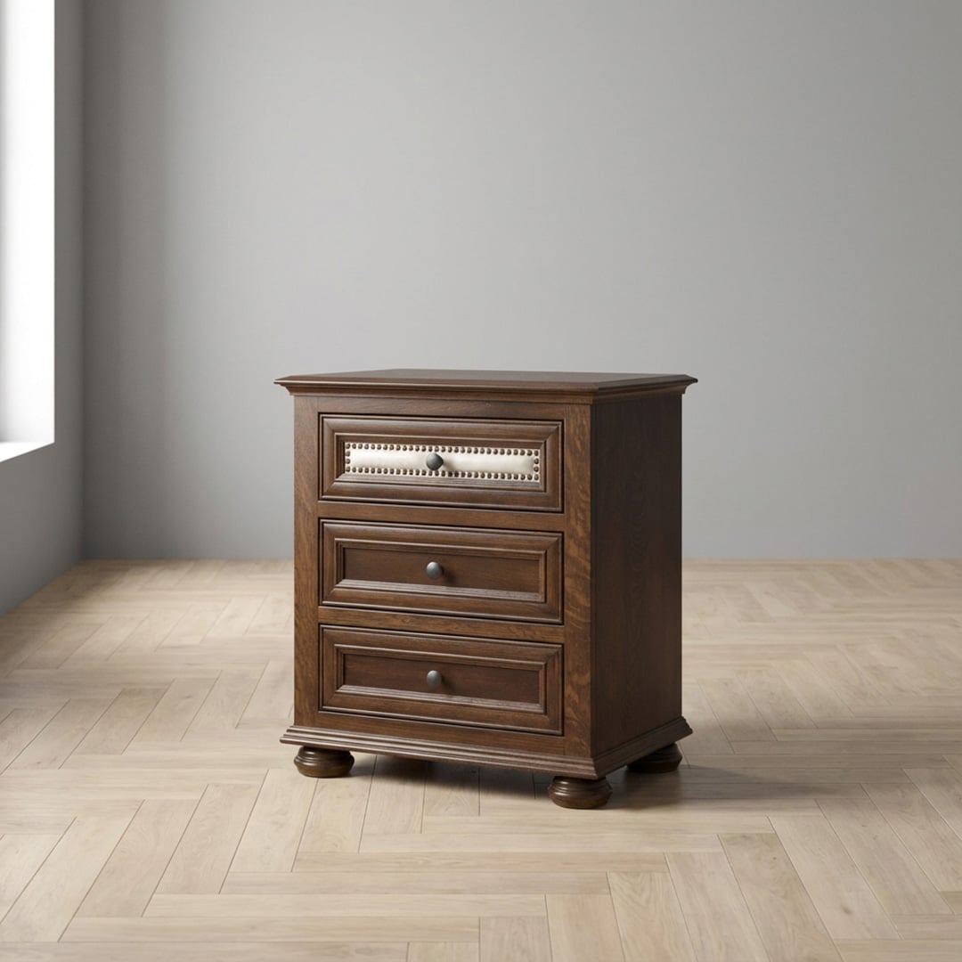 This nightstand offers a sophisticated bedside storage solution, combining classic wood craftsmanship with unique textures. Finished in a rich, warm brown that highlights the natural wood grain, this piece adds a sense of timeless elegance to any bedroom decor.