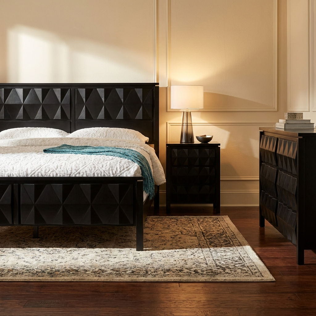 This modern bed is perfect for those looking for a truly one-of-a-kind design. A three-dimensional diamond pattern adorns the top two panels of the tall headboard, creating a dramatic first impression. The footboard features a matching diamond pattern. This unique design is not often seen in Amish bedroom furniture and is sure to stand out. Available as a queen or king size bed (headboard 50” h, footboard 20” h).