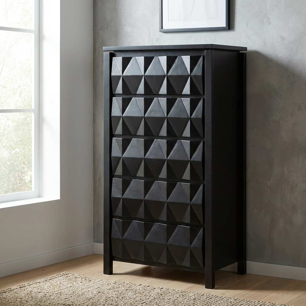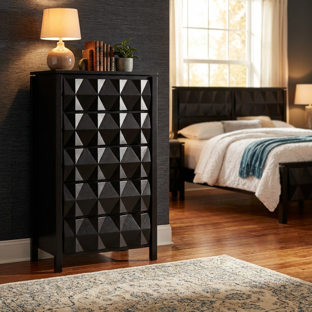 This modern five-drawer vertical chest (30½” w x 21¼” d x 58¼”h) is perfect for those looking for a truly one-of-a-kind design. A three-dimensional diamond pattern adorns each of the drawers, creating a unique look not often seen in Amish bedroom furniture