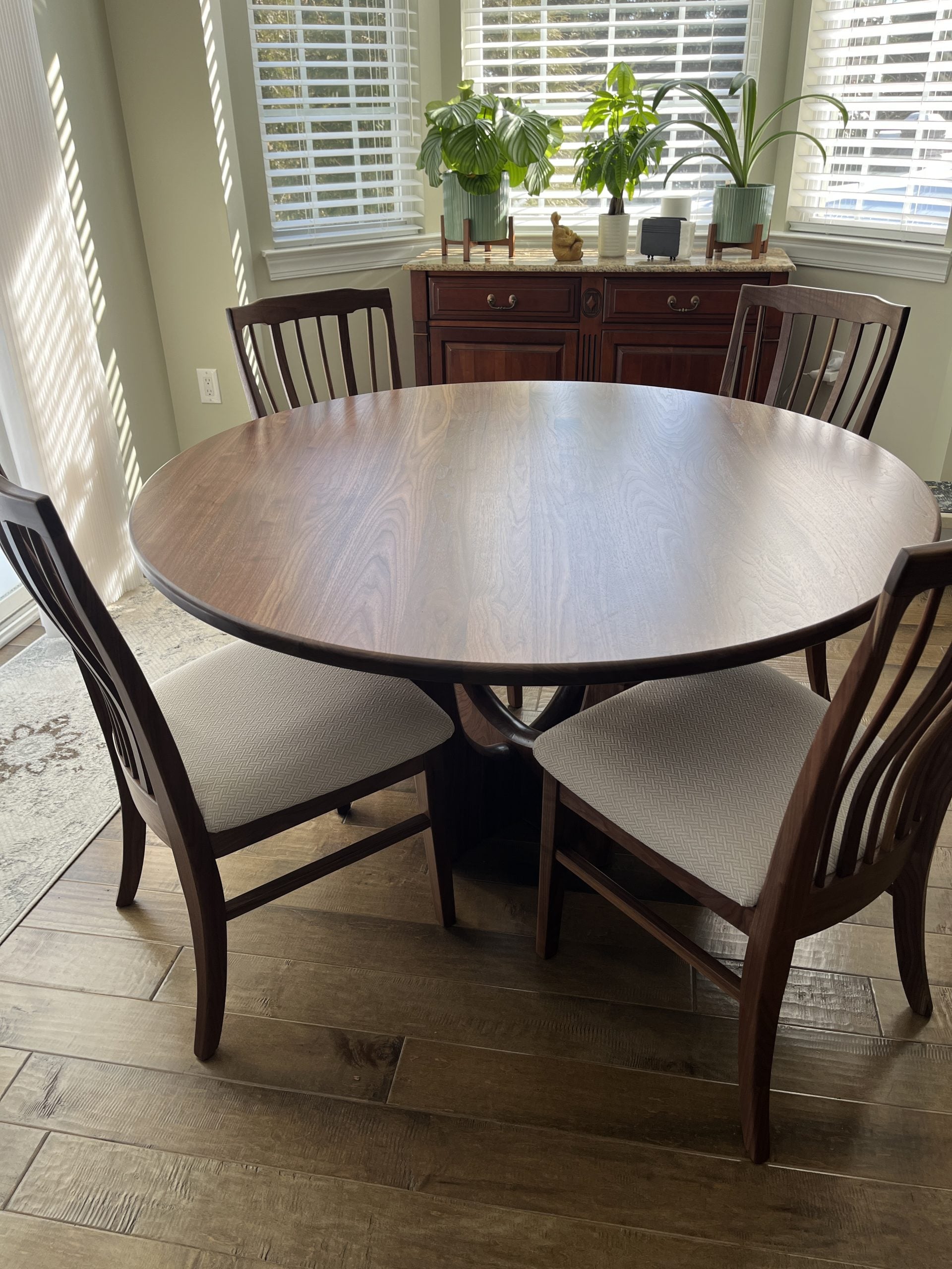 This modern round table is simple yet chic. It features a substantial 1¼” top with a classic bullnose style edge and a contemporary sculptural base. Round tables are perfect for maximizing seating in smaller spaces. Available in four sizes to accommodate any need. This table is only available as a solid top without leaves. Base Dimensions: Footprint – 22″, width at 18″H is 24″, width at top of base is 26″. Base is made from 2.5″ thick lumber.