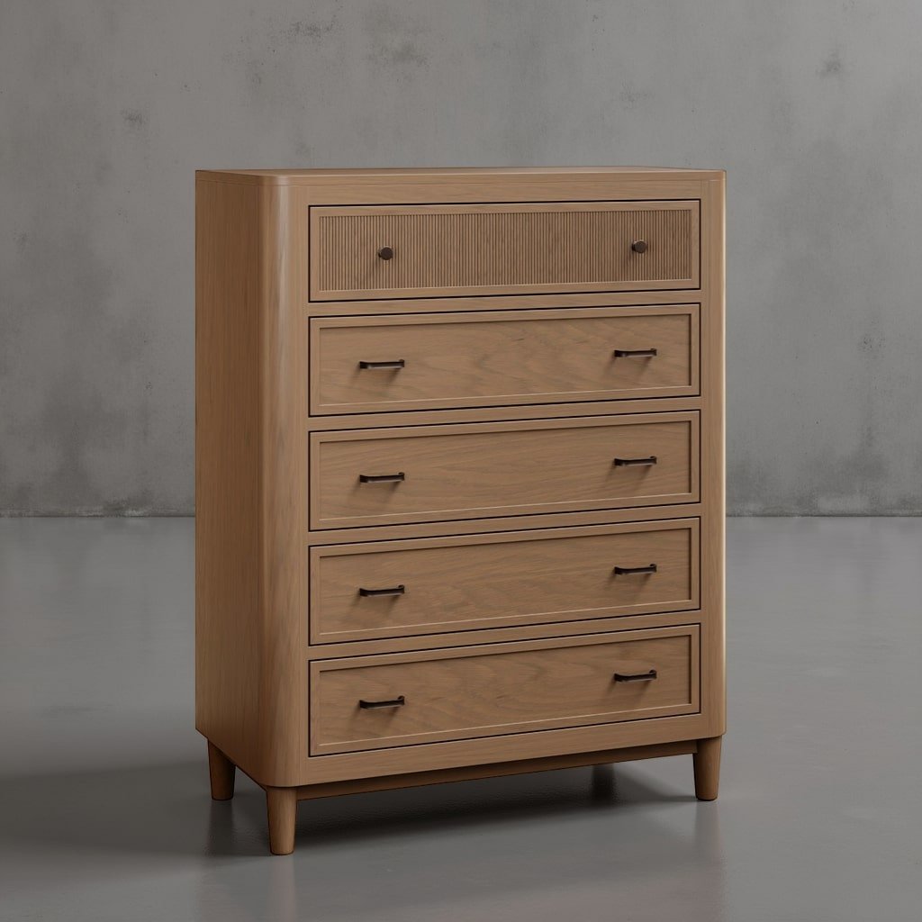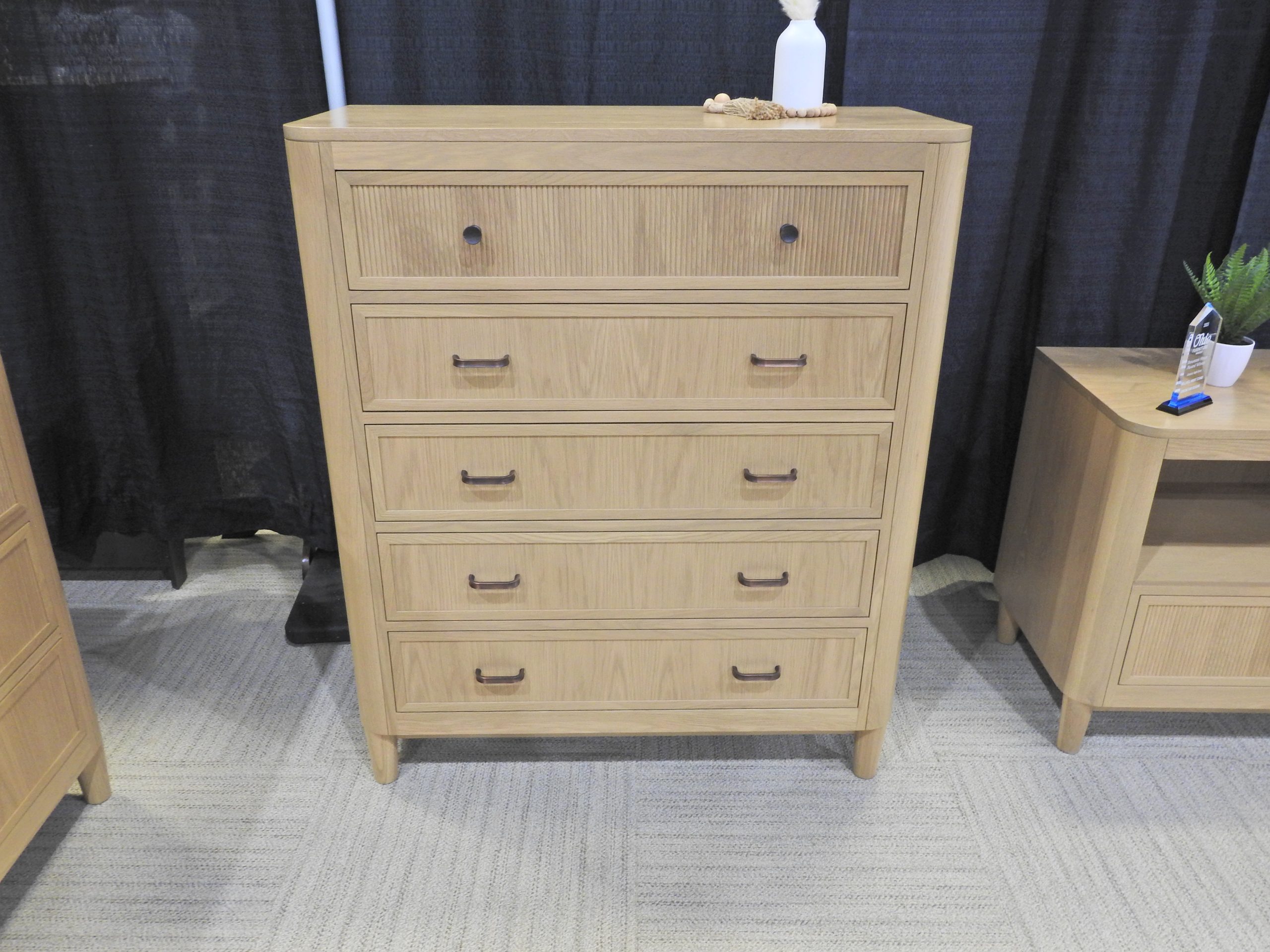 The Madeline Chest elegantly fits into any bedroom and completes the Madeline Bedroom collection. It features five dovetailed drawers, and the top one is reeded for a subtle flair. The Madeline Chest has solid sides, .75 Extension side mount drawer slides, and is Sturdy-Act compliant. Overall, the Madeline chest is 39.5″ wide, 18.625″ deep, and 47.5 inches high.
