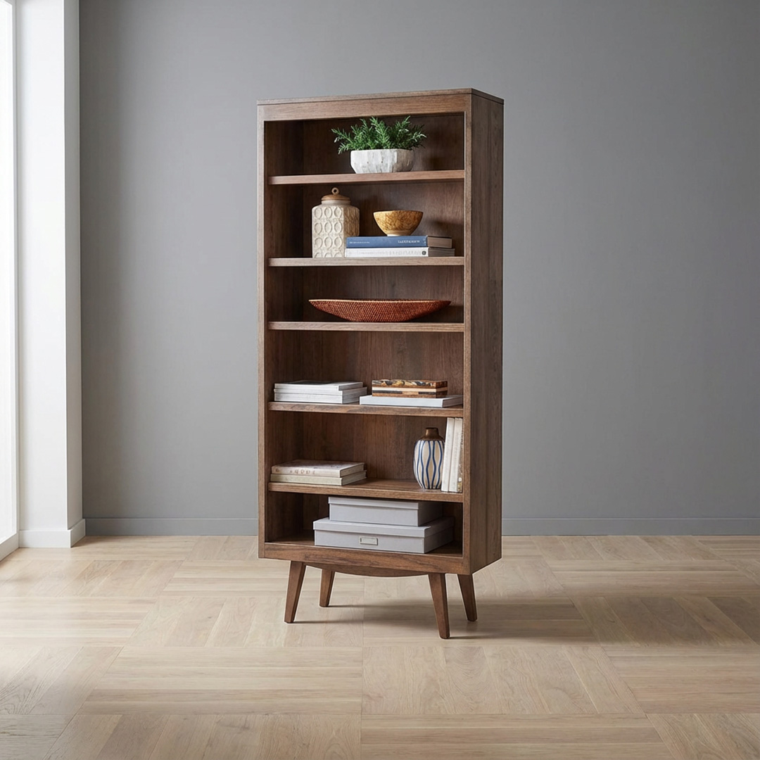 This tall, mid century modern style bookcase with angled legs brings warmth and structure to any space. Open shelving offers generous room for books, decor, and everyday essentials. 5 Shelves: 33″W x 12¾”D x 72″H; 4 Shelves: 33″ x 12¾” x 60″; 4 Shelves + 2 Doors : 33″ x 12¾” x 80″; • Shelf depth: 11½”D