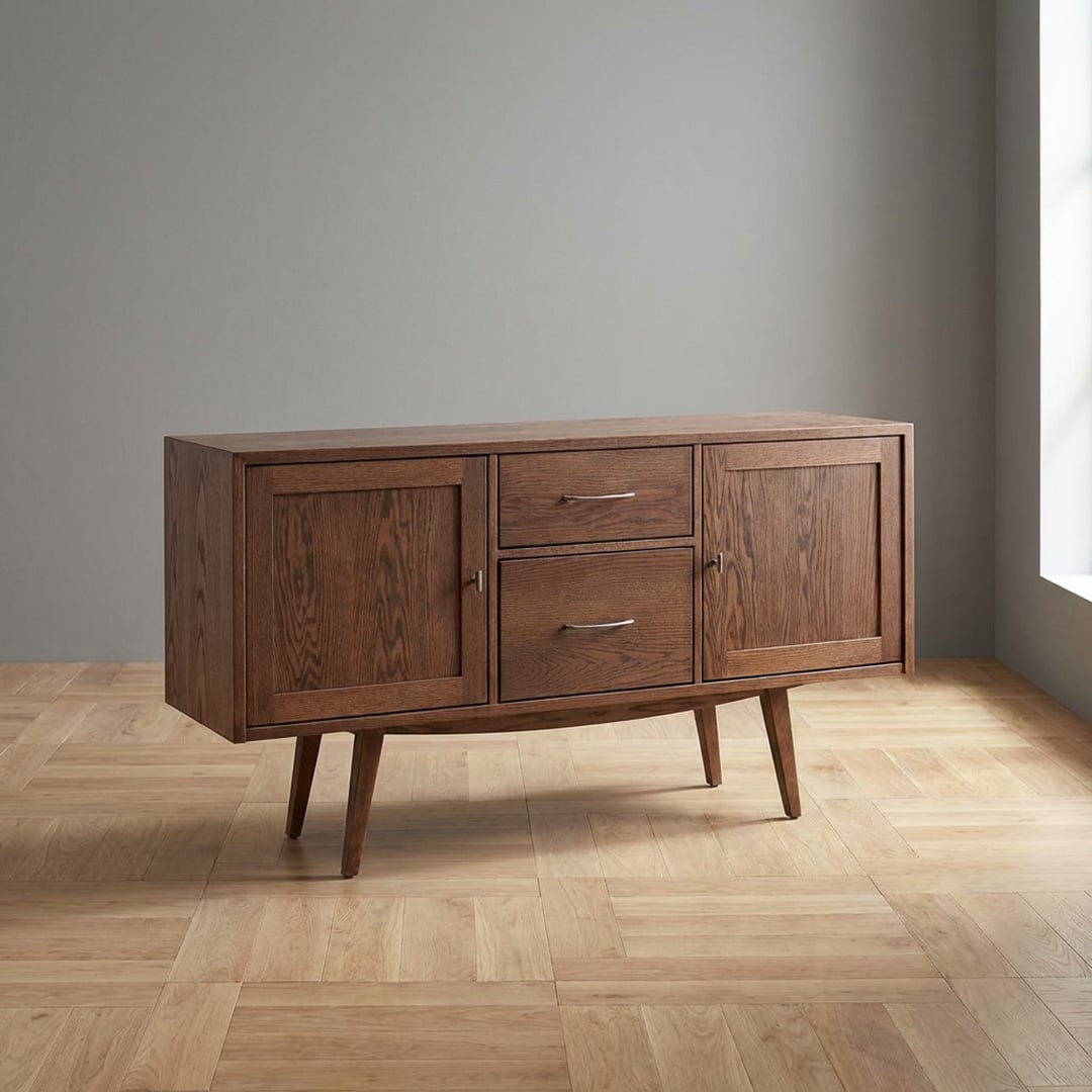 This credenza blends warm, natural tones with a clean, mid-century–inspired silhouette that feels both timeless and approachable. With spacious cabinets and smooth-gliding drawers, it offers practical storage while keeping a refined, uncluttered look that works beautifully in dining rooms, living spaces, or entryways. Dimensions: 63″W x 18″D x 34″H