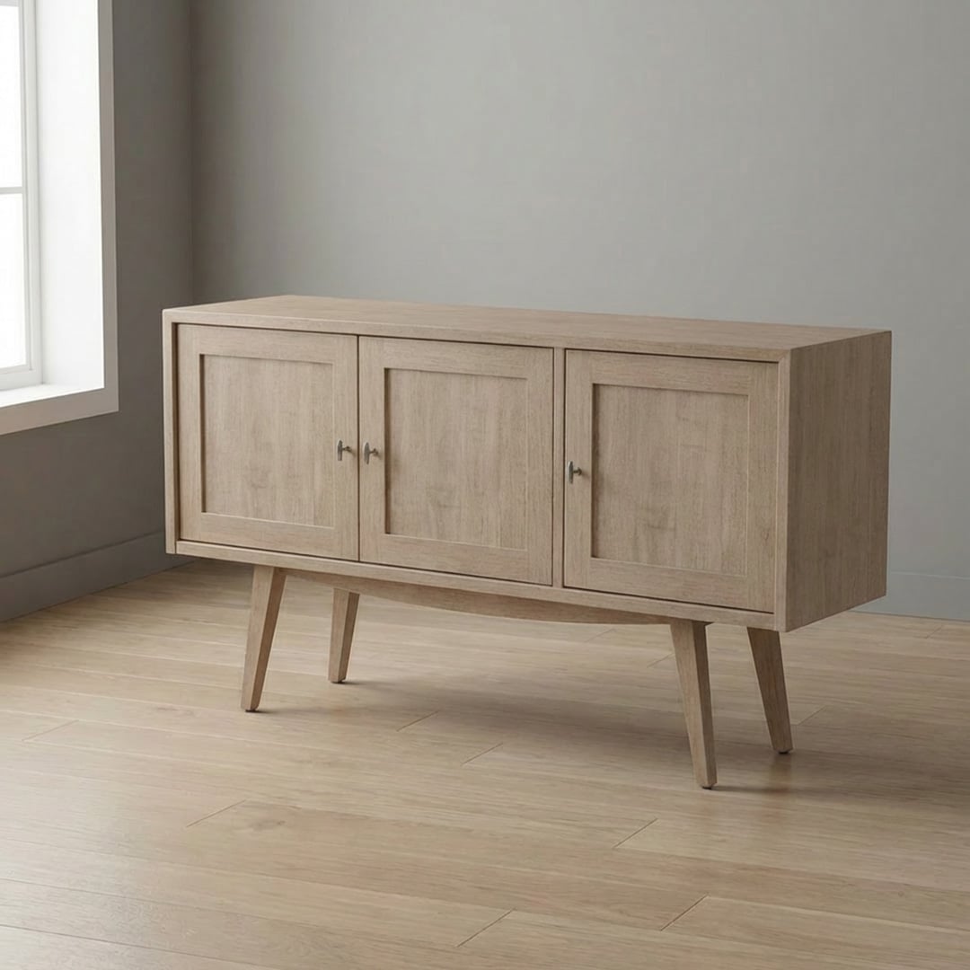This sofa table brings a warm, timeless feel with its smooth surfaces, softly framed doors, and gently angled legs that give it a light, balanced look. Dimensions: 54″W x 14″D x 31″H