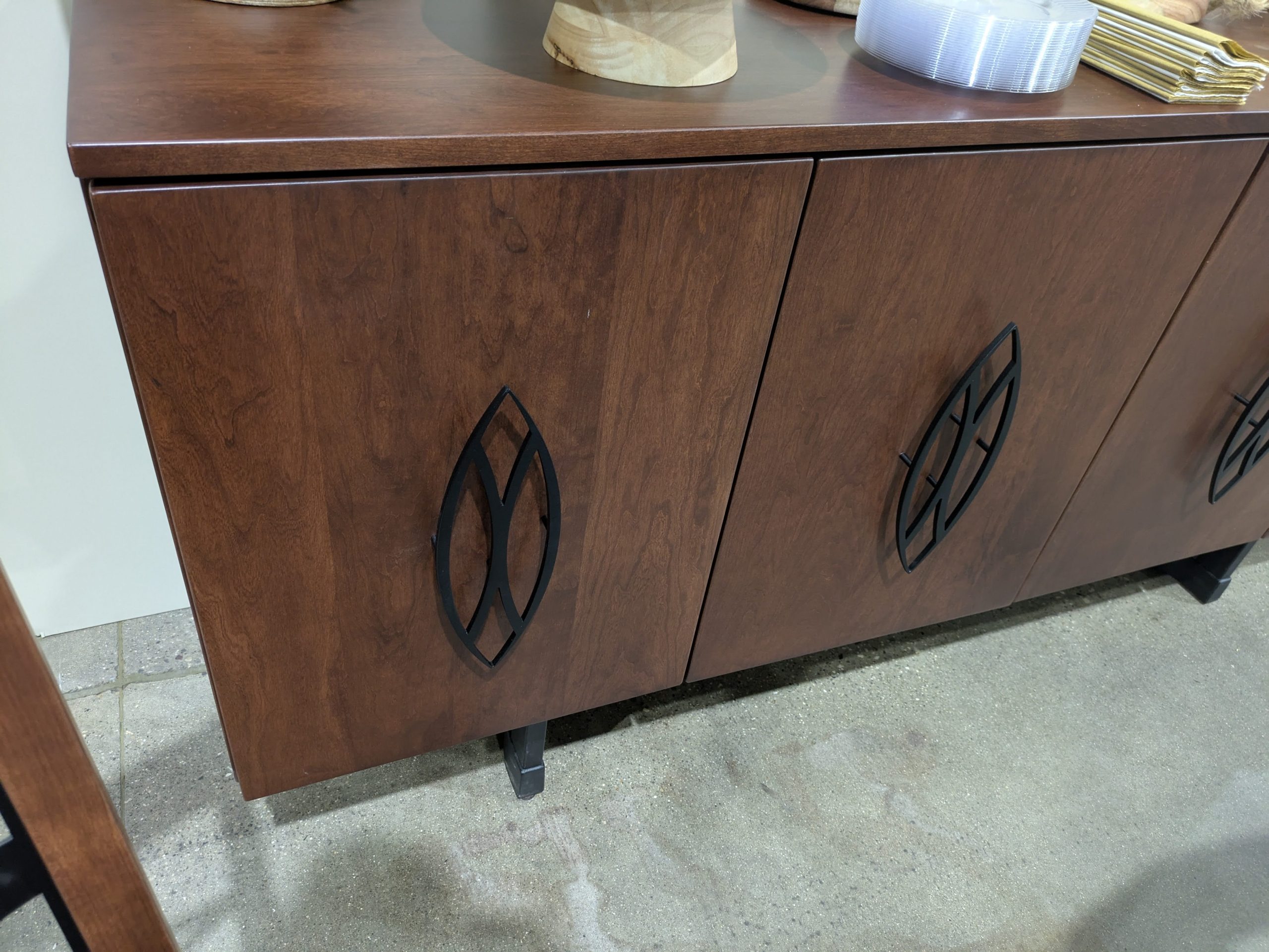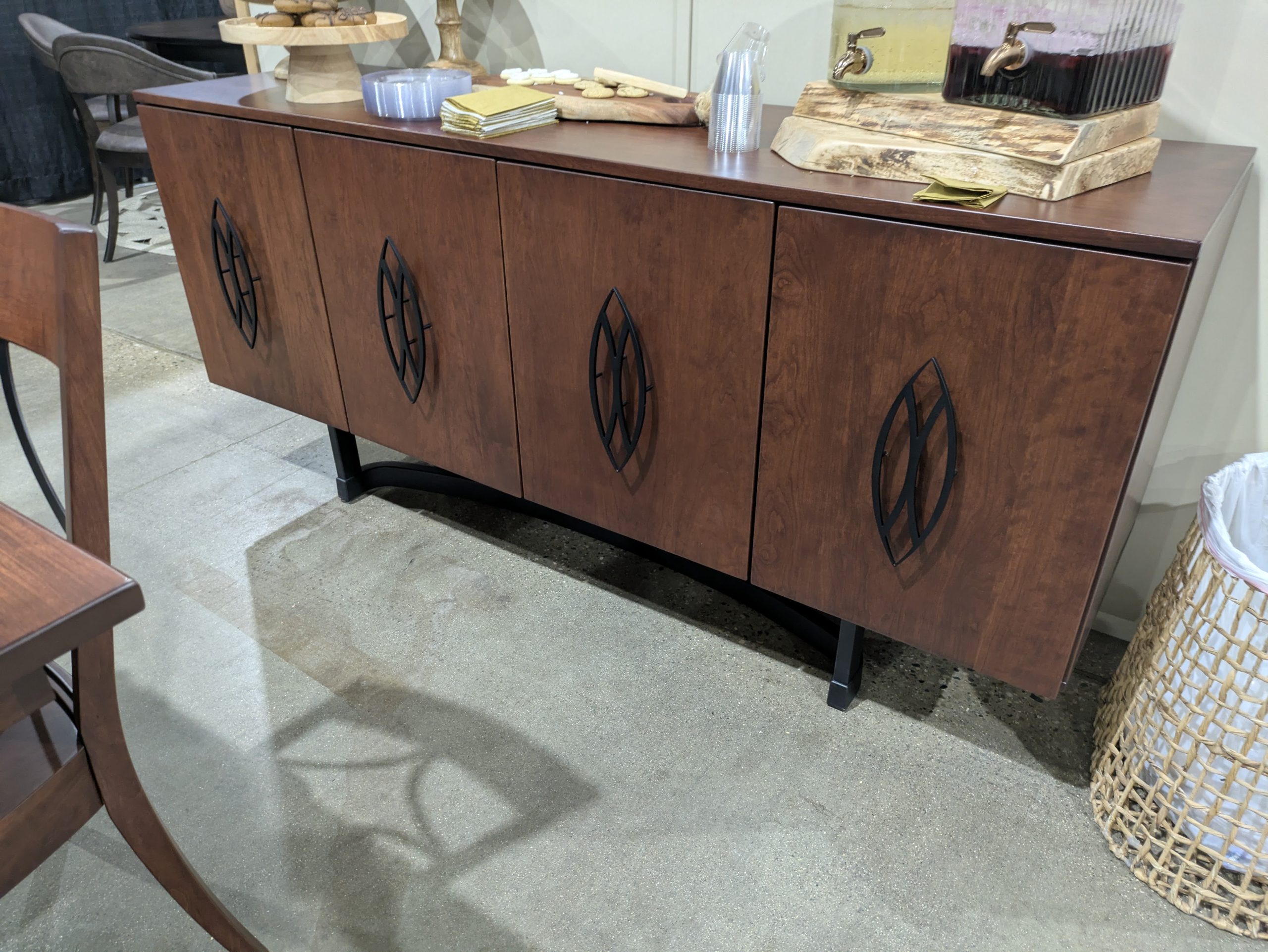 The Ria collection features a a table and this sideboard with the same curved metal design elements, its beautiful transitional design set is sure to get noticed. The metal base is available in multiple colors, and will contrast nicely with any stain color you choose. The lifestyle photo features a silver metal base and the case is made from Cherry wood with Charwood stain, while the solo photo features a gold metal base and an Earthtone stain. Widths available are 54″W and 72″W. Both cases are 20.5″D and 33″H.