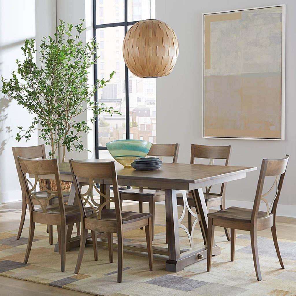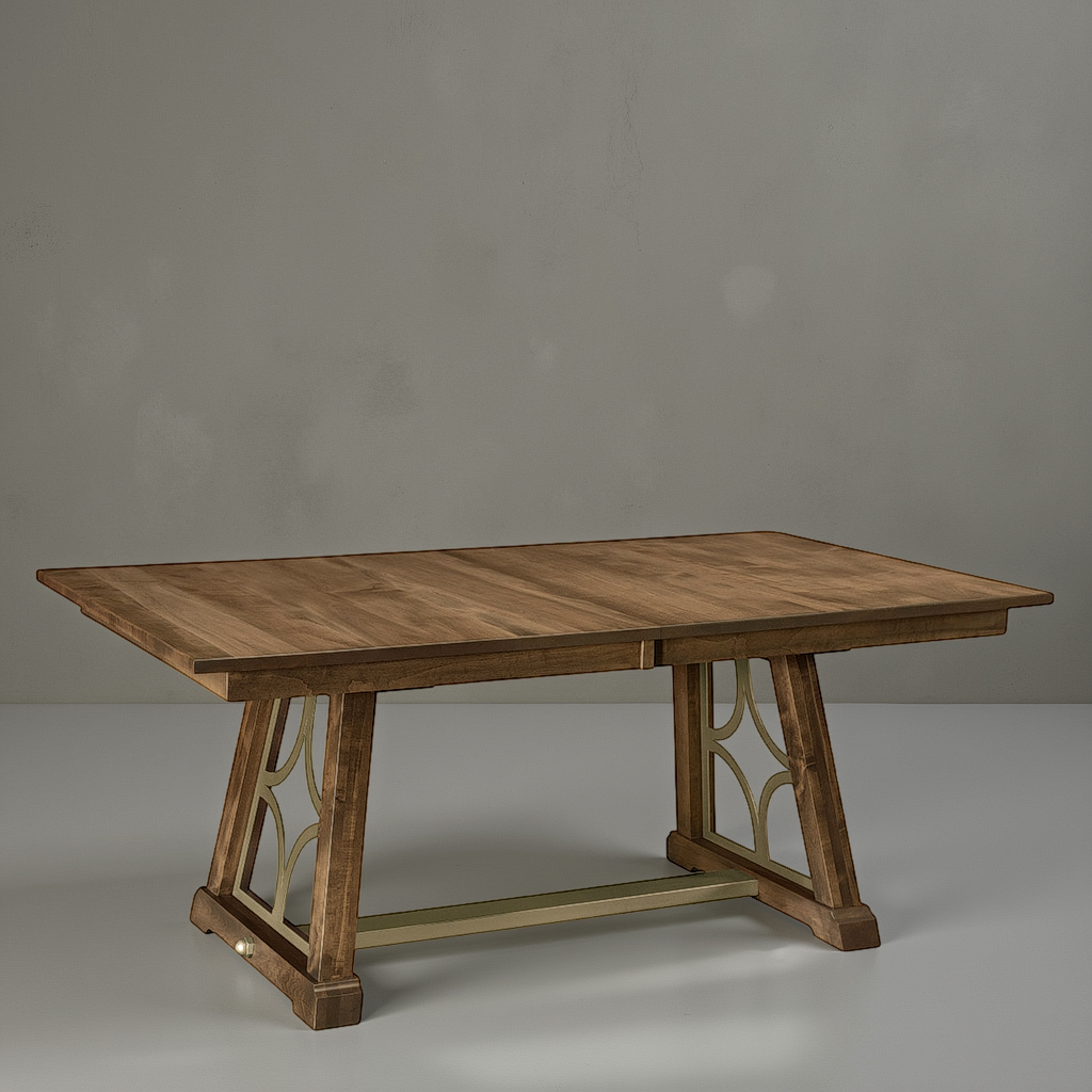 The Rowan Table features a solid wood rectangular top supported by a double trestle base. This piece brings a perfect balance of modern edge and timeless warmth, making it ideal for both everyday dining and upscale entertaining. The base features an elegant metal design which comes in five different metal colors to match any room. Metal samples are available upon request. The base dimensions are 30″ by 51″ and comes with the option of adding up to four leaves. Self-store options are available, but only unskirted.