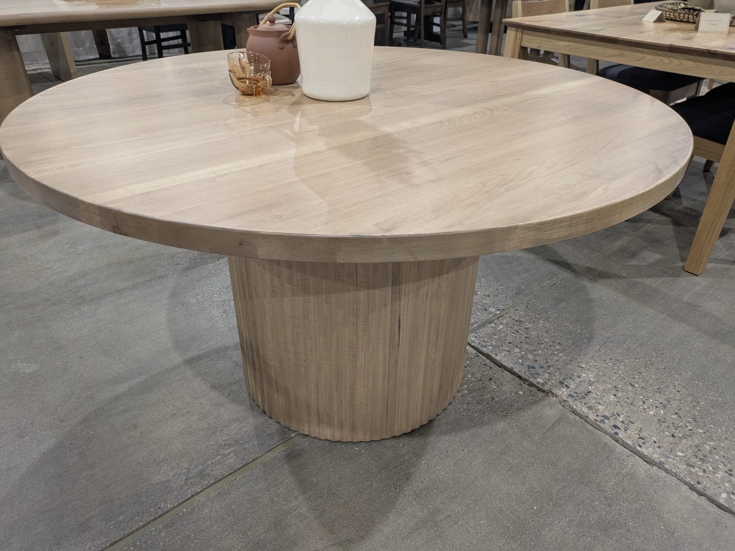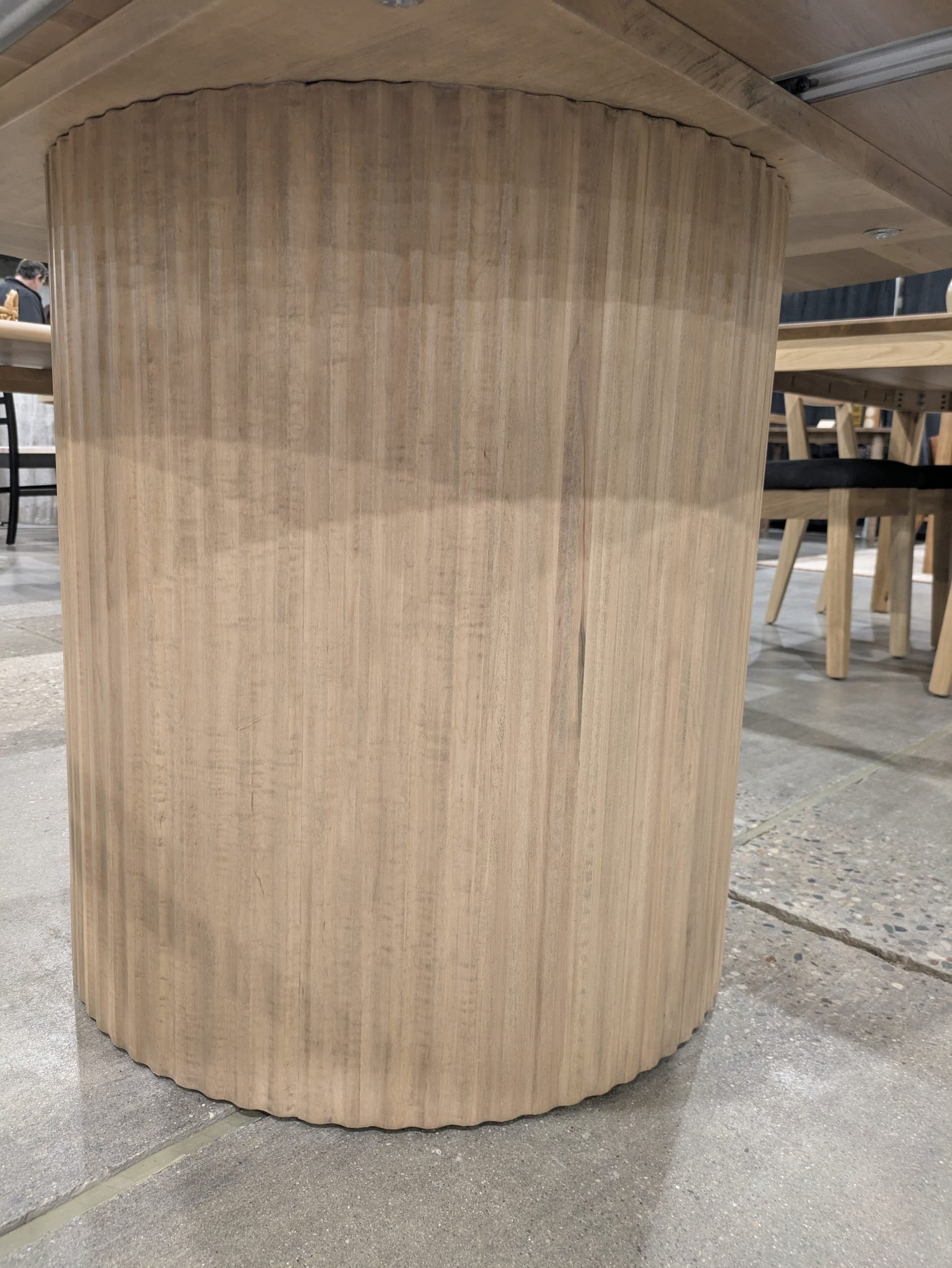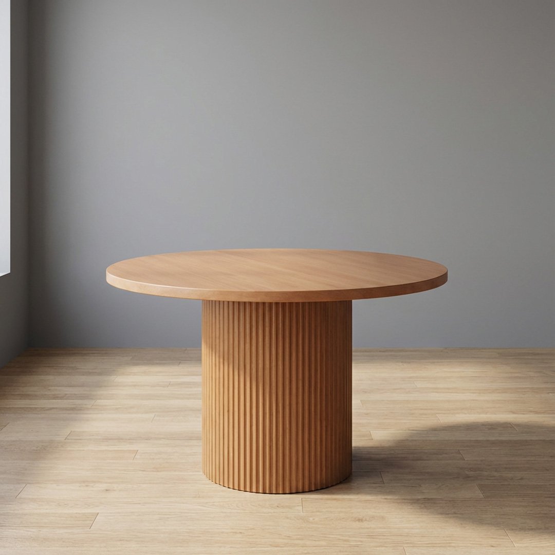 This single-pedestal table features a modern 24″ diameter base with reeding surrounding all sides that highlights expert craftsmanship and luxury. Its balanced proportions create a sleek, uncluttered look that works beautifully in both contemporary and transitional spaces. The top is 1.5″ thick. When adding leaves, the top of this table will change in style to include a skirt/apron underneath the top.