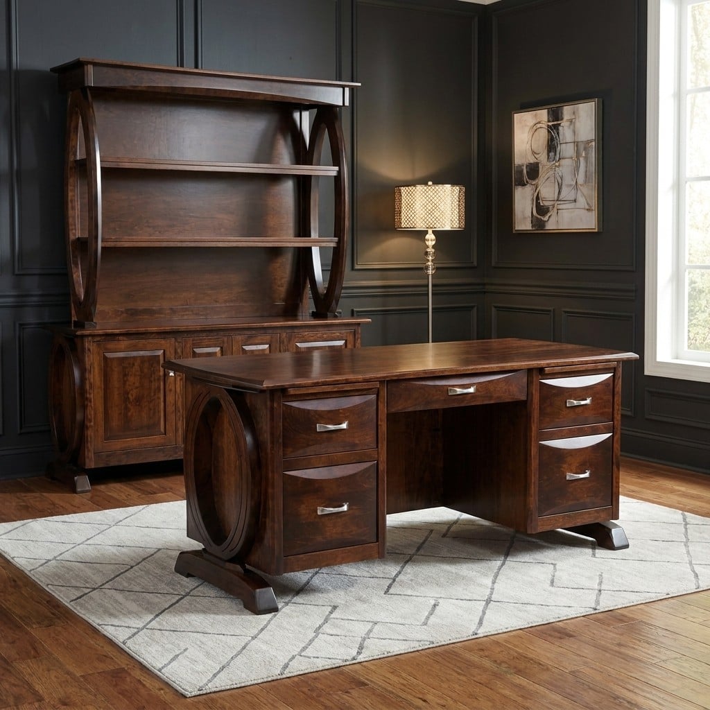 Politicians only wish they had a desk like this from which to navigate the halls of power. This desk has a finished back so it can be set up facing any direction. Standard features include two file cabinets, a pencil drawer, and satin nickel hardware. Dimensions: 67″W x 33″D x 31″H