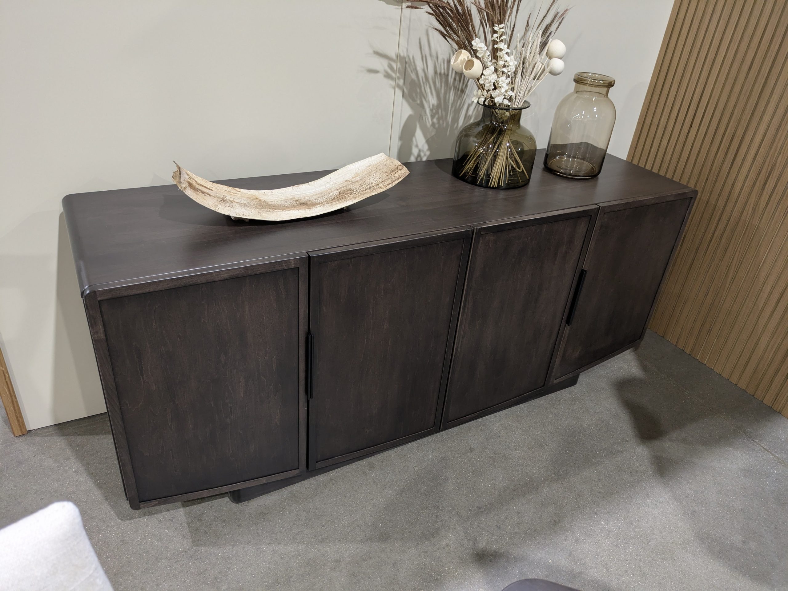 The Warren Server features a gently curved front and smooth, solid wood paneling that gives it a clean, minimalist look while still offering bold presence in any dining room. With its soft edges, low-profile base, and sleek vertical handles, this modern server is perfect for keeping your space organized without visual clutter. There are two adjustable shelves behind each door, and the server is available in two sizes.