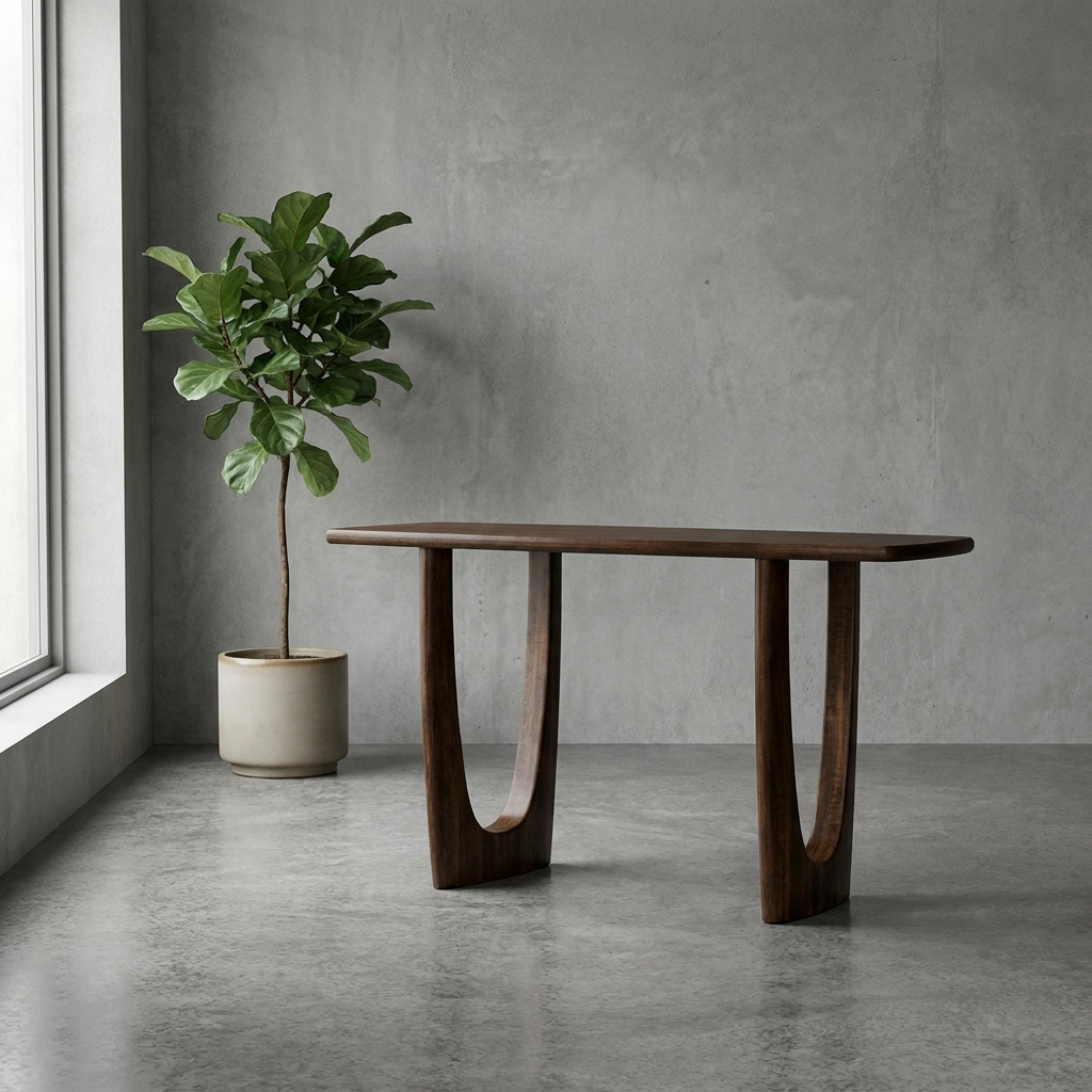This sofa table features a long, solid wood top that offers both durability and a refined, streamlined look. The gently rounded edges soften the silhouette, creating a smooth and polished finish. Supported by a sculptural base, it adds architectural interest while maintaining a clean, modern presence in any space. Dimensions: 54″W x 19″D x 30″H