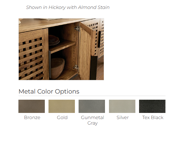 The Waverly Server features a unique checkered wood design on its doors that is perfect for someone who wants their server’s contents hidden but doesn’t like the fully solid look. With clean lines, a metal base and intricate detailing, this modern server is the perfect accompaniment to any dining space. Available in three sizes to meet any need or space requirement. Main image shown in 72” with almond stain on hickory wood. Dimensions: 36″w x 20 1/2″d x 33″h; 54″w x 20 1/2″d x 33″h; 72″w x 20 1/2″d x 33″h.